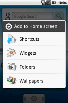 Start from the home screen. Then select "Menu » Add" or touch & hold the screen. The "Add to Home screen" menu opens.